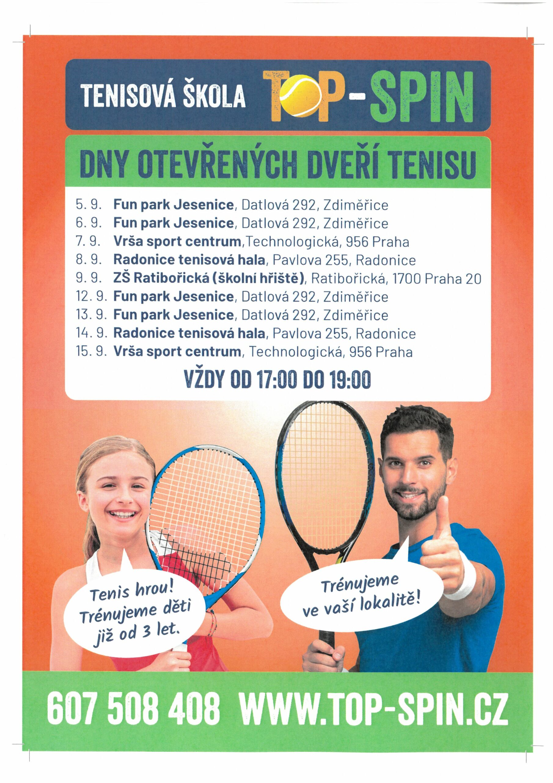 Tenisová škola Topspin pořádá Dny otevřených dveří tenisu. V tenisové hale v Radonicích, Pavlova 255 se uskuteční ve dnech 8.9.2022 a 14.9.2022 vždy od 17.00 do 19.00 hodin. Bližší informace naleznete na http://www.top-spin.cz.