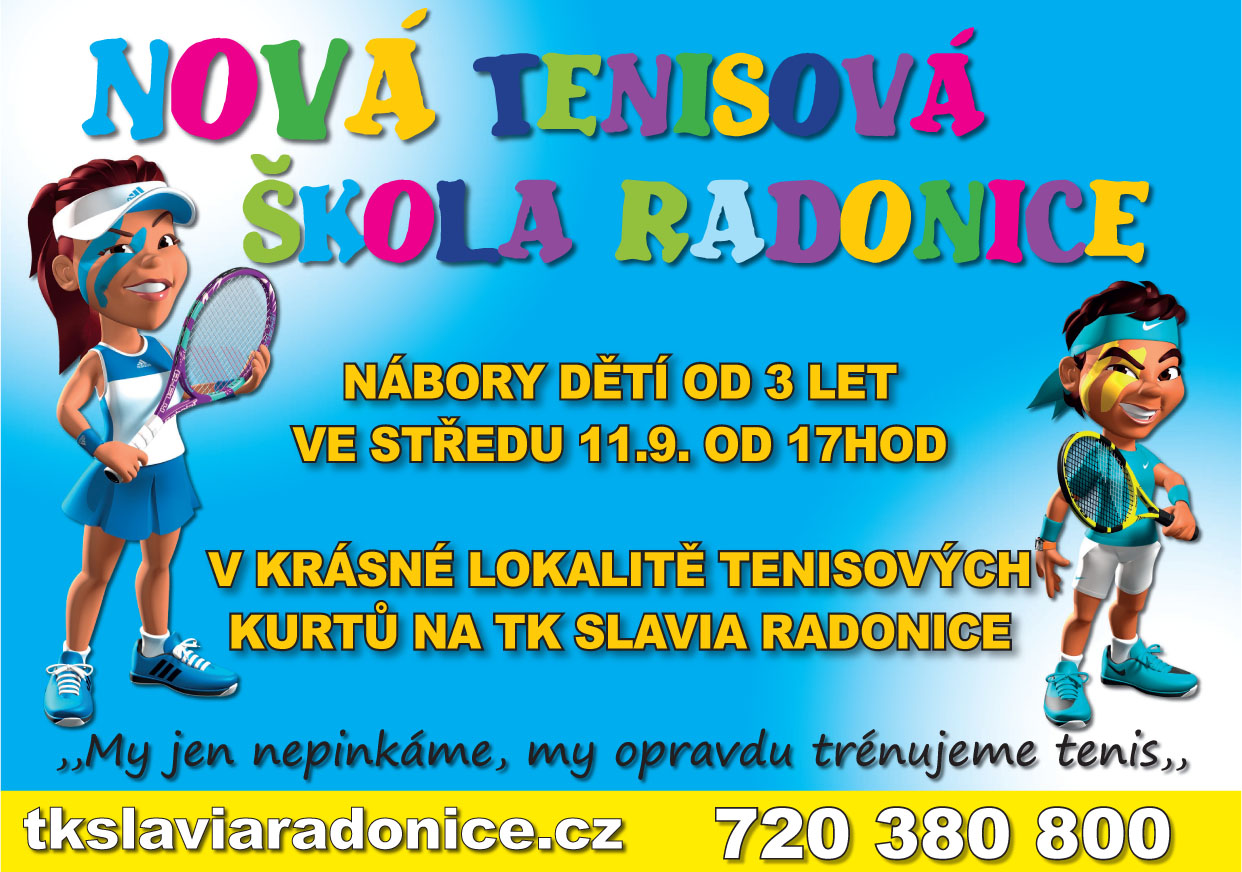 Tenisová škola Radonice bude ve středu 11. 9. 2024 od 17.00 hodin pořádat v lokalitě tenisových kurtů TK Slavia Radonice nábory dětí od 3 let.