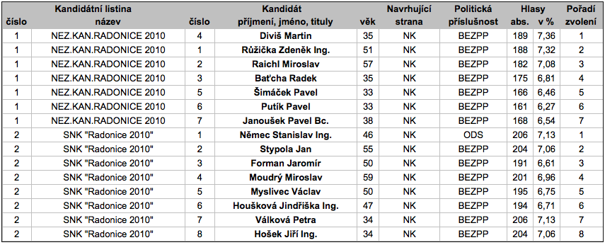 VÝSLEDKY VOLEB DO ZASTUPITELSTVA OBCE RADONICE konaných ve dnech 15. – 16. ŘÍJNA 2010