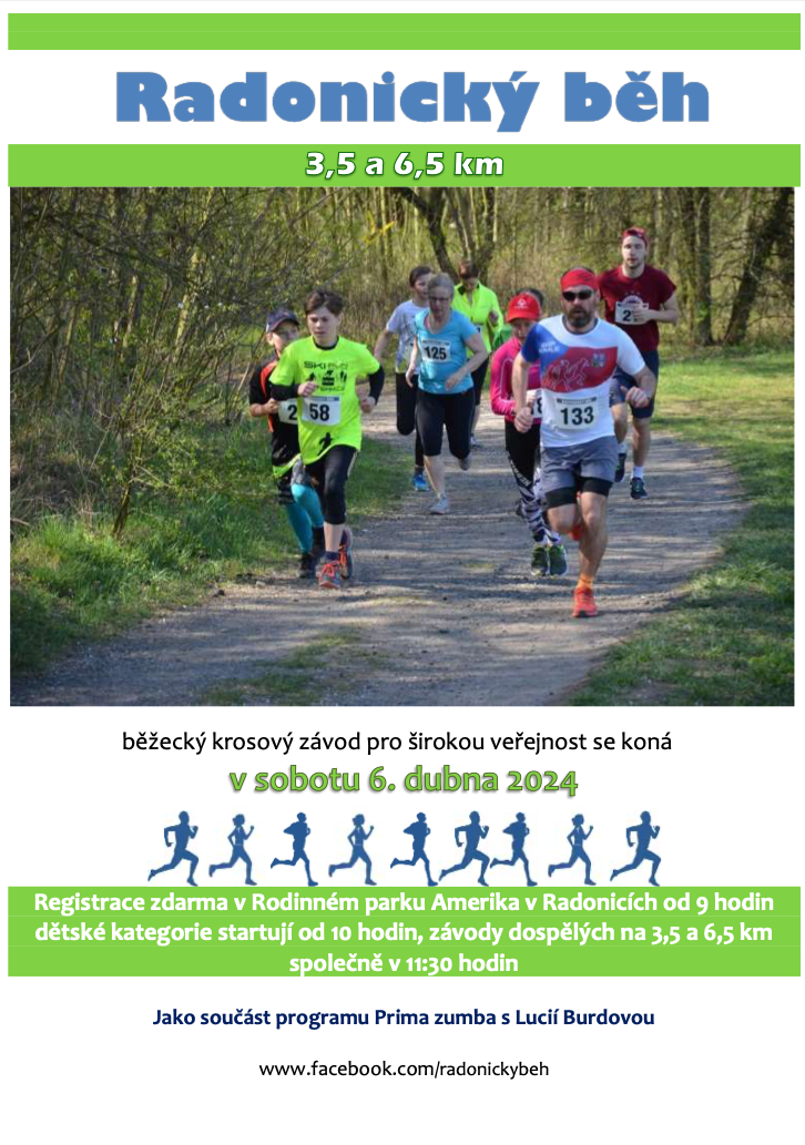 V sobotu 6. dubna 2024 se koná Radonický běh – běžecký krosový závod pro širokou veřejnost. Registrace zdarma v Rodinném parku Amerika v Radonicích od 9.00 hodin. Bližší informace naleznete v letáčku.