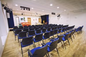 - V přední části sálu se nachází mobilní jeviště, které je však možné odstranit a zvětšit tak daný prostor.