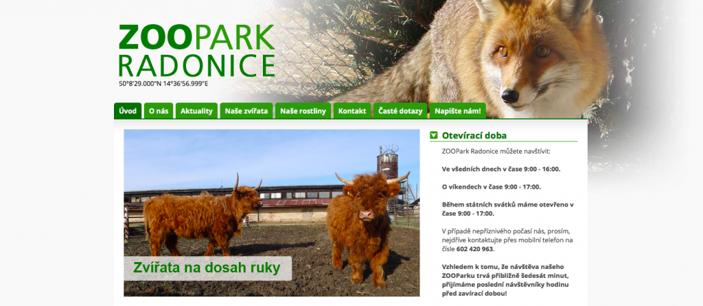 V našem ZOOParku Radonice se dostanete do bezprostředního kontaktu se zvířaty jak domácími, tak divokými, což je nevšední a poutavý zážitek nejen pro děti, ale i pro dospělé – většina zvířat je ochočená natolik, že se nechají pohladit (mnohá se dokonce vnucují), a žádný milovník přírody se přece nenechá ochudit o příležitost pohladit si některé z chovaných zvířat!