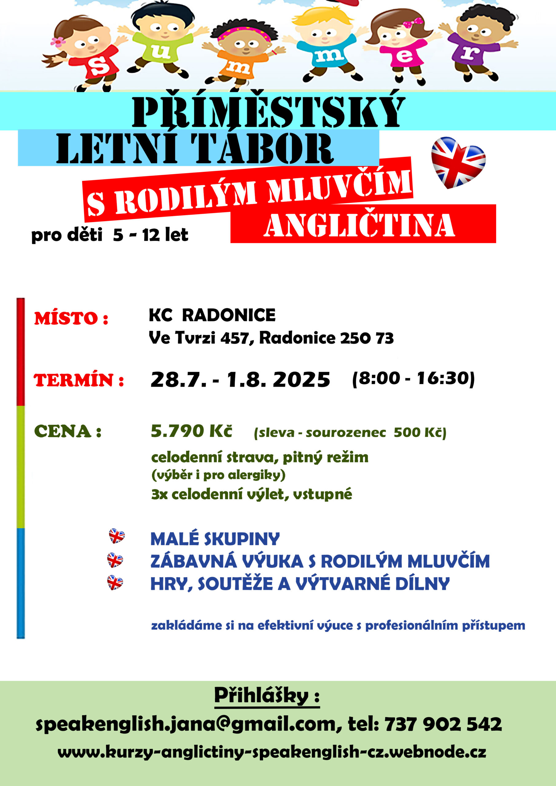 V letáku naleznete informaci o konání příměstského letního tábora pro děti od 5 do 12 let s rodilým mluvčím – angličtina.